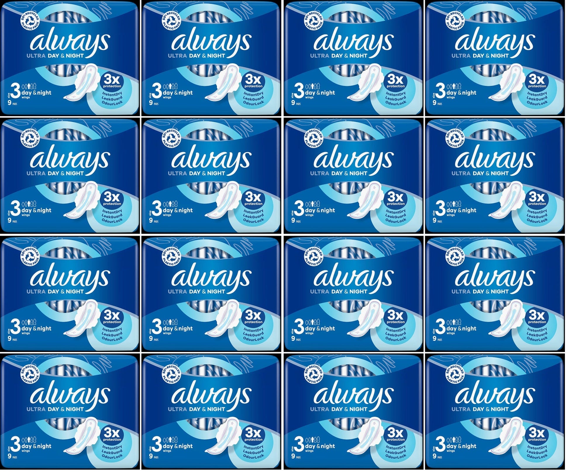 16 x Always Ultra Day & Night Sanitary Towels (Size 3) Wings 9 Pads